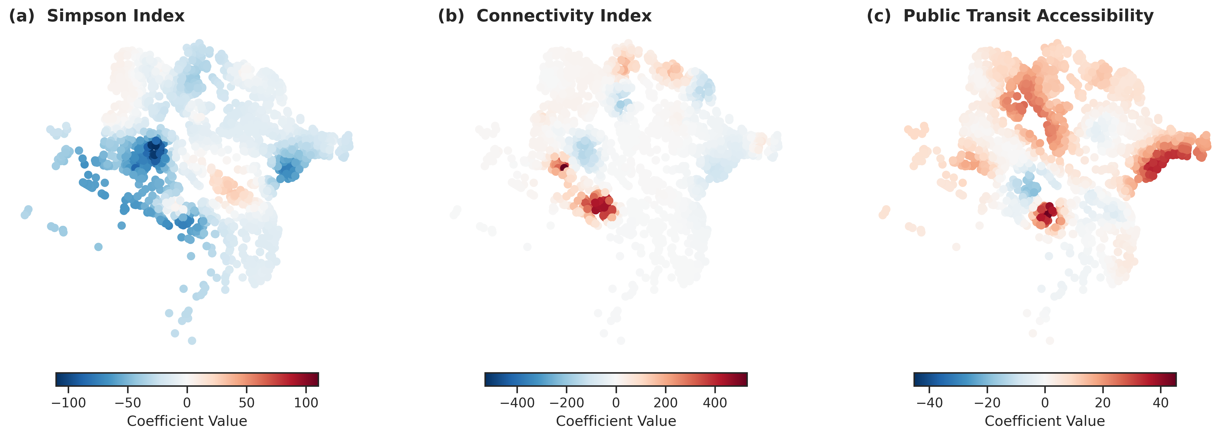 - Transit accessibility - High accessibility (>2.0) strongly increases emotional responses